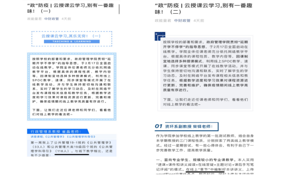 按照学校部署确保疫情特殊时期的教学工作平稳有序展开,学院全力保障上半学年的线上教学和下半学年的“线下+线上”教学秩序。成立学院网络教学保障领导小组和疫情防控领导小组,部署研究制订开学工作方案和开学后各项工作预案,平稳有序做好开学准备。自疫情始所有课程建立微信群、实行“学委日报制”,严控教学质量、保障教学效果。根据疫情情况及开学安排,及时调整学生毕业生毕业论文、就业指导面试、大学生创新创业立项及结项、转专业、招生宣传等工作安排,最大限度降低疫情对学生学习及就业等方面的影响。积极关注师生线上教学感受,进行调研和公众号推送,并及时做好教学保障和师生心理保障。