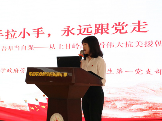 为深入学习贯彻落实习近平总书记在党史学习教育动员大会上的重要讲话精神,扎实高效开展好党史学习教育,切实做到“学史明理、学史增信、学史崇德、学史力行”,充分发挥党员先锋模范作用,2021年4月9日下午,SUNBET申搏党委精心组织五个学生党支部的26名学生党员骨干分别前往中国农业科学院附属小学政法路校区和农科院校区,面向13个班级共500余名少年儿童结合党史讲授专题党课。