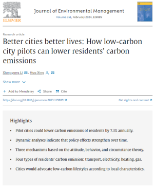 除前述国际顶刊论文外,邢华教授和博士生李向阳还在Frontiers in Psychology(SSCI期刊)发表了“Drivers of behaviors: How do city pilots shape residential energy-related emissions through perceptions?”,在《干旱资源与环境》(CSSCI期刊)发表了“减污降碳:低碳城市试点的协同效应”等论文,产生较强的学术影响力。