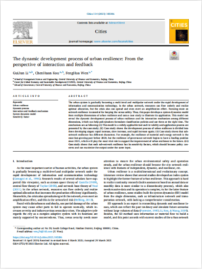 近日,申搏官网温锋华副教授在申搏官网AA类期刊Cities发表学术论文,题目为The dynamic development process of urban resilience:From the perspective of interaction and feedback.