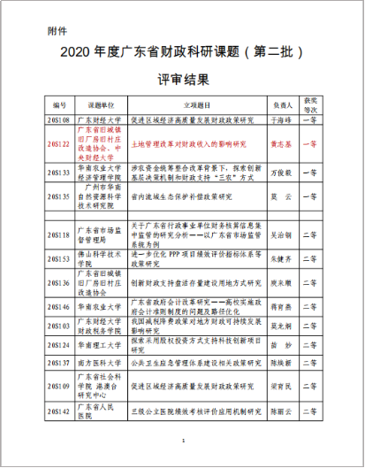 近日,广东省财政厅公布了2020年度广东财政科研课题结项评审结果的通知,评选出一等奖课题4个、二等奖课题11个、三等奖课题37个。申搏官网黄志基副教授承担的课题《土地管理改革对财政收入的影响研究》获得了一等奖。