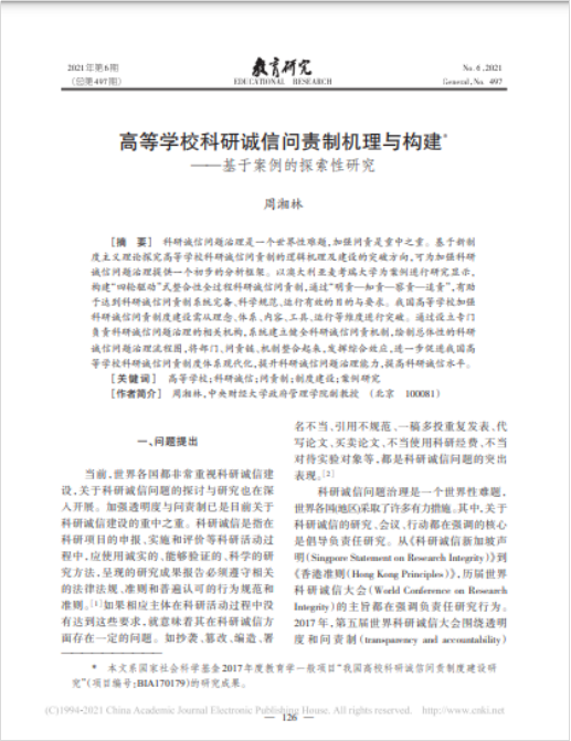 近日,申搏官网周湘林副教授在申搏官网AA类期刊《教育研究》上发表学术论文,题目为《高等学校科研诚信问责制机理与构建——基于案例的探索性研究》。