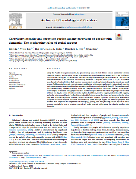 近日,申搏官网公共事业管理系刘一伟博士以通讯作者在Archives of Gerontology and Geriatrics发表学术论文,题目为Caregiving intensity and caregiver burden among caregivers of people with dementia: The moderating roles of social support.