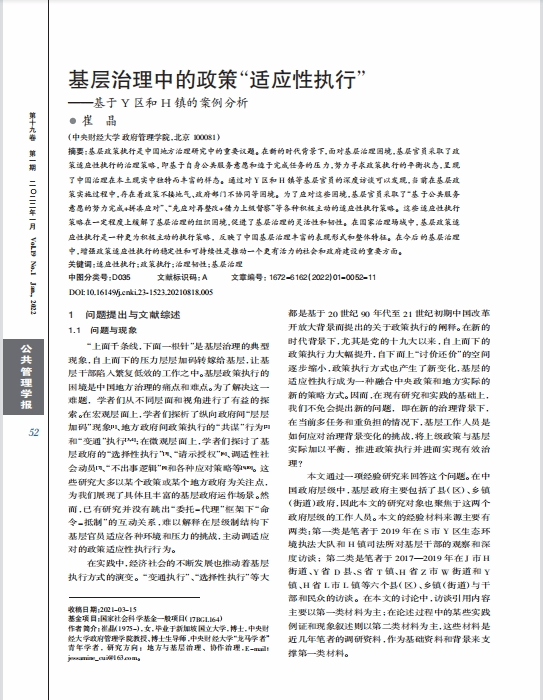 近日,申搏官网崔晶教授在《公共管理学报》发表学术论文,题目为《基层治理中的政策“适应性执行”—基于Y区和H镇的案例分析》。
