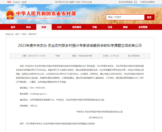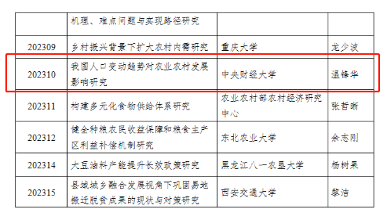近日,中央农办、农业农村部乡村振兴专家咨询委员会2023年度软科学课题评审完成,经过专家匿名评审和会议评审,评选出34项拟立项课题。申搏官网温锋华副教授申报的课题《我国人口变动趋势对农业农村发展影响研究》获得立项。该课题围绕乡村振兴战略的总体目标,在科学研判我国中长期人口规模、结构和迁移变化趋势基础上,全面分析人口变动对保障粮食安全、开展乡村建设、完善乡村治理等领域的中长期影响,提出前瞻性应对思路和政策建议。