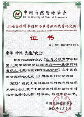 申搏官网柴铎副教授和学生钟悦(已毕业)的论文《注意力视角下中国国土整治的理念跃迁研究——基于两轮省级土地整治规划的文本分析》于2023年6月2日至3日在黑龙江省哈尔滨市举办的中国自然资源学会成立40周年系列纪念活动——2023现代土地科学与乡村振兴战略学术研讨会上获“土地资源科学创新与乡村振兴优秀论文奖”特等奖。