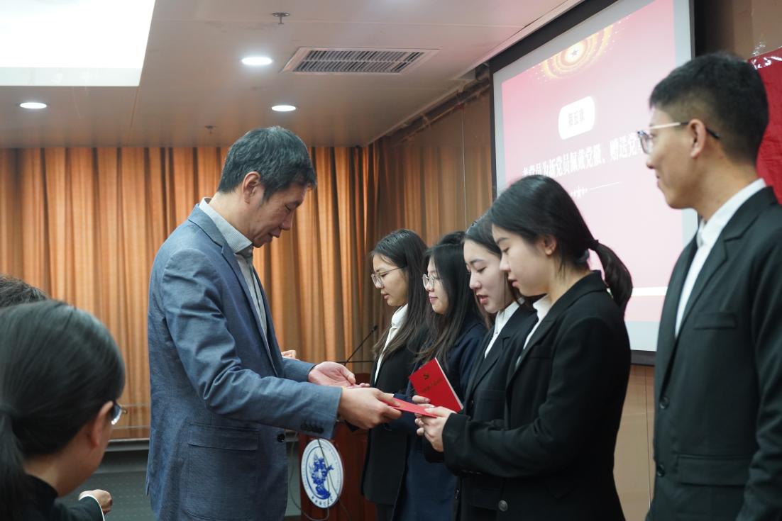 学院党委书记于鹏,党委副书记、纪委书记杨柳、党委组织员张小燕和各党支部书记等为24名新党员佩戴党徽,赠送《中国共产党章程》,并合影留念。