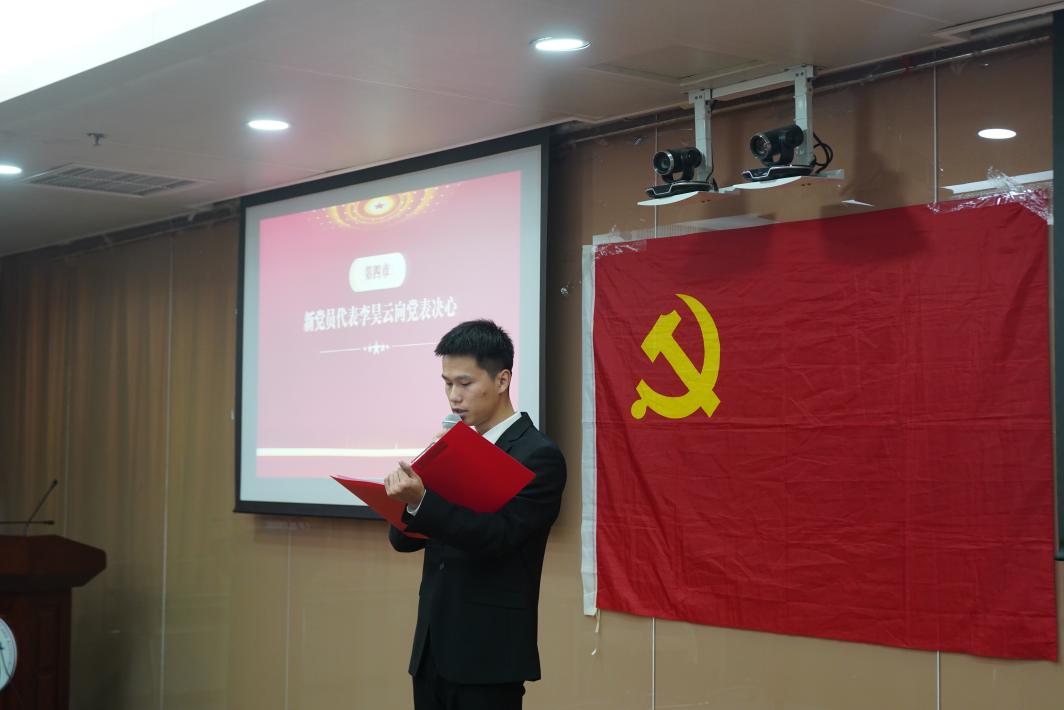 随后,新党员代表李昊云发言。他表示,将牢记入党初心,时刻以一名中国共产党党员的标准严格要求自己,发挥共产党员的先锋模范作用,和新党员同志们一道,不断加强理论学习、提高思想认识、勇于担当作为,向先进学习,向榜样靠近,坚决做到思想上看齐,精神上对齐,行动上靠齐。