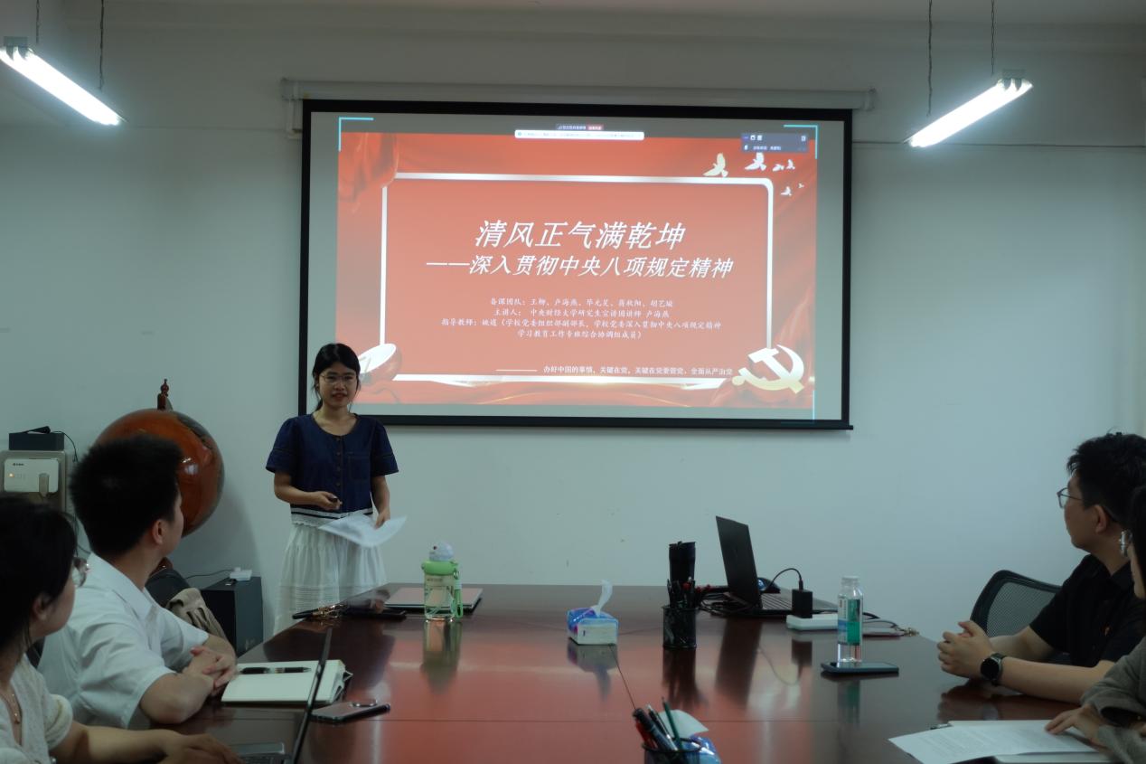 为扎实开展深入贯彻中央八项规定精神学习教育,强化党员理论武装,在学院党委的统筹安排下,学院4个研究生党支部通过集体学习、专题研讨、交流分享等多种形式,不断深化对中央八项规定精神及其实施细则的理解与认识,全体党员在政治素养和纪律意识方面有了显著提升。在此基础上,2025年5月15日,SUNBET申搏博士研究生党支部、学术型硕士研究生第一党支部、学术型硕士研究生第二党支部和MPA党支部于主教1407共同举办了理论联学共建活动,活动由博士研究生党支部书记闫新宇主持,研究生宣讲团讲师卢海燕作主题宣讲。