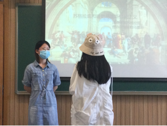 在看似枯燥难懂的《西方政治哲学导论》上,国政系党支部组织委员耿喜梅老师带领国政19级同学穿越回公元前300多年古希腊比雷埃夫斯港,跟着苏格拉底一起去探讨治国理政,努力把书读活,呈现书中故事。19级课前同学们经过课前的认真准备,如编剧本、定造型、预演等,在课堂上呈现了一幕幕《理想国》中的场景,如苏格拉底与克法洛斯探讨什么是正义,与阿得曼托斯探讨如何教育和培养城邦中的人,以及柏拉图《理想国》中描述的“洞穴隐喻”的场景。