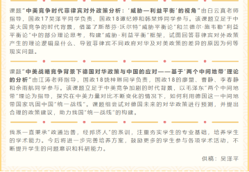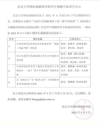 5月7日,由北京大学国际战略研究院组织的2021年春季学生课题研究项目(第十期)中标课题公布。经匿名专家组评审,我系学子申请的两项课题全部中标(第十期共有4项课题中标)。这是我系学生第三次斩获该院课题。白云真老师指导的国政17吴泽平同学负责、国政18谭纪婷和韩杲烨同学参与的课题“中美竞争时代菲律宾对外政策分析:‘威胁—利益平衡’的视角” ,与江涛老师指导的国政18饶梓琳同学负责、国政18的廖盟、曹静、李春静和余雨航同学参与的课题“中美战略竞争背景下德国对华政策与中国的应对——基于‘两个中间地带’理论的分析”,是对当下中国外交重大新议题的研究,是国政系师生在第二课堂内容上的新探索。
