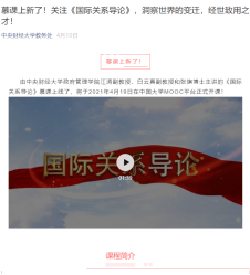4月19日,由国政系副主任江涛副教授、系主任白云真副教授和张旗老师讲授的《国际关系导论》在“中国大学MOOC”正式上线,深刻和精彩的讲解已经吸引了880多位学生加入课程学习。课程组老师在国际关系理论和实践的相应部分对习近平外交思想理论与实践进行了一定的讲解。这不但是中财国政系老师首次登上中国大学慕课平台,也是中财国政系老师首次在该平台进行课程思政的一个尝试。