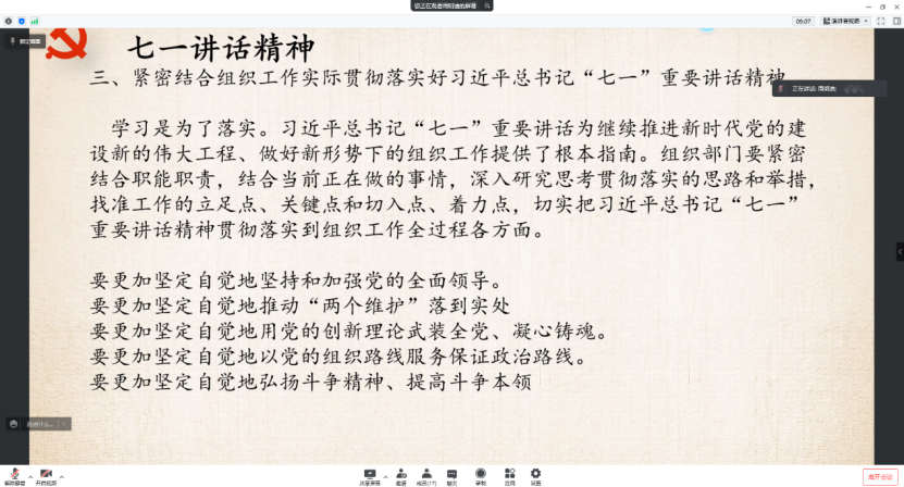 在周明迪同志的带领下,党员们首先学习了习近平总书记“七一”重要讲话精神。习近平总书记“七一”重要讲话是坚定信仰信念信心的最好教科书。习近平总书记在“七一”重要讲话中,从革命、建设、改革、新时代4个时期深情回顾了我们党一百年走过的光辉历程,以“三个深刻改变”凝练概括了中国共产党成立的深远影响,用“四个伟大成就”系统总结了我们党团结带领人民为实现中华民族伟大复兴建立的卓越功勋,高度评价了我们党百年奋斗在中华民族发展史、世界社会主义发展史、人类社会发展史上的重大意义。