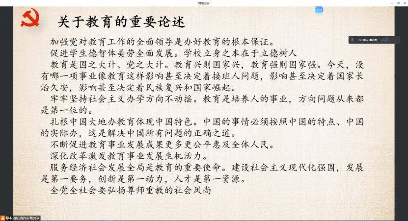 接下来,党员们学习了习近平总书记关于教育的重要论述。党的十八大以来,以习近平同志为核心的党中央高度重视教育工作,把教育摆在优先发展战略地位。习近平总书记在治国理政中,对教育工作提出了一系列富有创见的新理念新思想新观点,系统回答了一系列方向性、全局性、战略性重大问题,形成了习近平总书记关于教育的重要论述,标志着我们党对教育规律的认识达到了新高度,为推进新时代教育改革发展提供了强大思想武器。