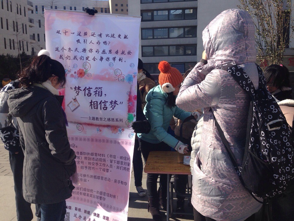 短短两天里,在同学们的热情宣传下,现场氛围持续高涨。即使寒风阵阵,也抵不住同学们内心的那份感激,大家都陆陆续续前来,积极参与到此次活动中。在活动现场,有的同学拿着写好的明信片来邮递感恩,有的同学当场写下一片真挚感情,还有的同学积极学做DIY折纸,他们借助“梦信箱”这个平台将惊喜传递,将一片真情演绎得淋漓尽致。那一张张漂亮可爱的明信片,那一个个专注认真的神情,不仅展现了大家对此次活动的兴趣,也体现出当代大学生积极向上的良好风貌和一颗满怀感恩的赤子之心。