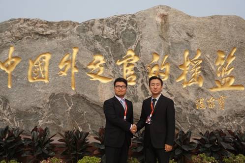 在温家宝题写的“中国外交官的摇篮”前合影留念