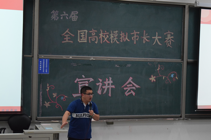 紧接着由柴铎老师上台为大家做了更详细的介绍,柴老师就“谁组织参与、为什么参与、如何参与、组织程序、对于比赛的认知”等五个方面为大家做出了更加深入的讲解。柴老师讲到,本次市长大赛意在锻炼大家调研、组织、表达、应对等四方面的能力,并从调究报告、施政纲领、角色扮演、领导才华、应变能力等五个尺度进行衡量。在选题方面,建议各参赛队伍应注意“战略性”即对影响未来发展影响,“全局性”即涉及多个方面,“新颖性(时效性)”和“针对性(聚焦性)”。并认为好的选题是成功的一半慎选过热和虚拟问题,不选争议或过大的命题,老瓶要装新酒,要脚踏实地。同时强调调研以及临场发挥的重要性,作为一名“市长”,应具有与之相配合的气场,并同时兼具宏观视野和人文情怀,回答问题应观点明确,应对得当,这是一个近距离观察和思考城市问题的机会,这是一次体验当“市长”的机会,一个实践探求现实难题答案的机会,一个展示自我的机会。