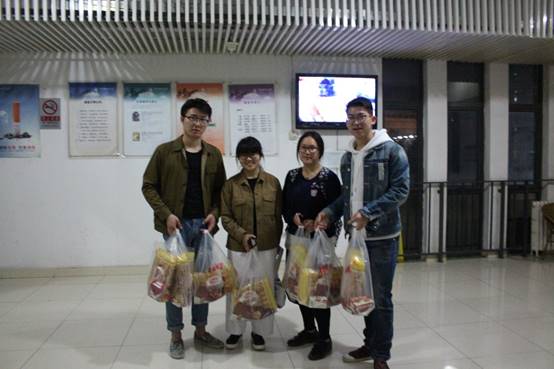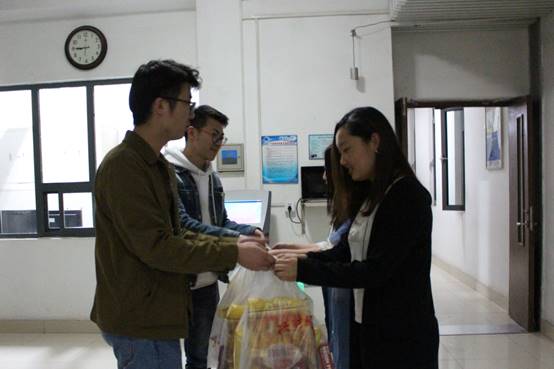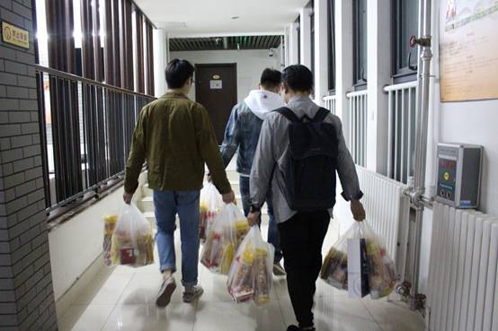 第二站是15号楼,在宿管阿姨登记后,两位老师就直奔政管男生宿舍。敲响宿舍门,走出来的同学迷茫地看着老师,直到收下零食才弄明白老师的来意。惊喜之余是满满的感动;有帮助他人的满足,还有收获关心的快乐。