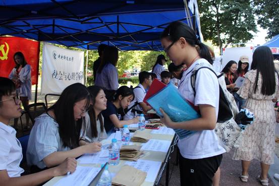 早上7点,迎新工作者们已经到达接待点做好准备,接待陆续到达的每一位新生。热情洋溢的迎新工作者们分工明确、各司其职,每个人都有条不紊地进行工作,为每一位新生及其家长提供贴心的服务。志愿者们帮助新生注册、分发礼包、引导新生参观校园。早晨天气微凉,志愿者们顶着大风坚守岗位,中午炎热的阳光令志愿者们汗流浃背。但无论是大风还是炎日,都不能抹去志愿者脸上真诚的微笑。