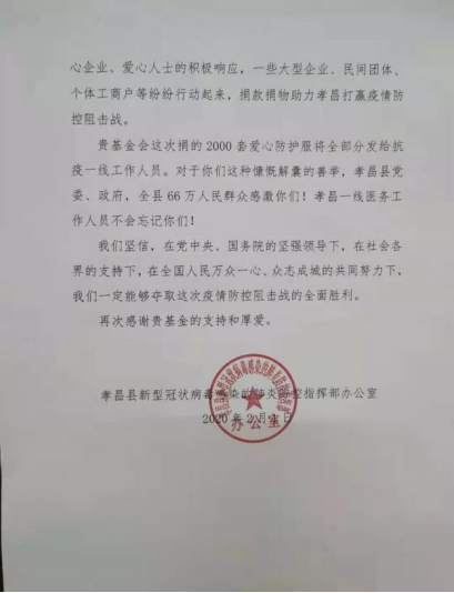 来自孝昌县防控指挥部的感谢信