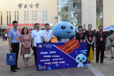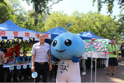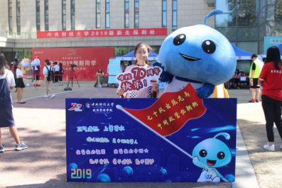 诚挚的服务让新生和家长们感到丝丝舒心,精美的展板更是让新生和家长们阵阵欣喜。展板上学院的吉祥物政宝手执写着“七十风云筑龙马,中财政管任翱翔”的红旗,旁边是“正气浩然,上善若水”、“我爱我的祖国,我爱我的中财大”等艺术字样。精美的展板和可爱的政宝吸引了许多新生合影,为大学生活的第一天留下了珍贵的纪念。此外,今年学院为每一位新生都准备了精美的小礼品——钥匙扣和扇子。钥匙扣一面是热情欢愉的政宝,另一面则是中财大校徽和“SUNBET申搏”的字样。扇子则以蓝色为底,一面是政宝可爱的头像和“SUNBET申搏”“正气浩然,上善若水”的字样,另一面则是点赞手势的词云,词云囊括了学院的院训——正气浩然,上善若水、学院的专业名称和专业术语等,直观而有效地向新生们介绍了SUNBET申搏。扇子底部还有“我赞我的政管19,我爱我的中财大”字样。纪念品虽小,但是将迎新与中财大70周年有机结合,在具有学院特色的同时将视野放大,颇有思想。