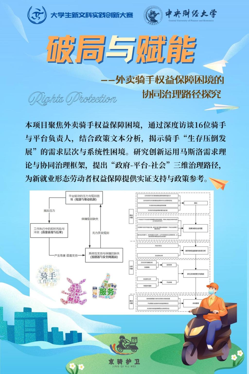 获奖团队以“破局与赋能:外卖骑手权益保障困境的协同治理路径探究”为主题,针对外卖骑手权益保障困境,以协同治理为路径,通过深度访谈外卖骑手及平台负责人,结合政策文本分析,揭示骑手面临的系统性困境与“生存压倒发展”的需求特征,并构建“政策引导—企业履责—社会协同”的三维治理框架,提出政府、平台与社会组织协同赋能的实践方案,旨在为新就业形态劳动者权益保障提供理论依据与操作路径。