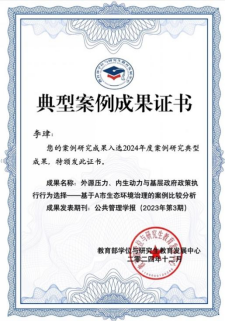 近日,教育部学位与研究生教育发展中心发布2024年度典型案例成果名单。申搏官网李珒副教授发表于《公共管理学报》2023年第3期的案例研究论文《外源压力、内生动力与基层政府政策执行行为选择——基于A市生态环境治理的案例比较分析》,入选2024年度案例研究典型成果。该论文通过案例剖析,构建分析框架,阐释政策执行主体行为选择的动力因素与作用机制,对基层政府政策执行行为多样性问题作出了理论回应。