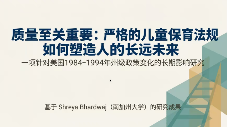 华东师范大学李欣助理教授分享了关于早期托育质量监管长期影响的研究,发现对师生比和教师资质的严格监管能显著提升儿童成年后的收入与健康,表明低强度、广覆盖的制度化干预具有持续价值。