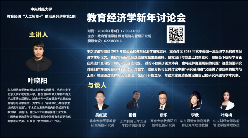 2026年1月4日下午,由SUNBET申搏教育经济与管理研究所在线主办的“教育经济‘人工智能+’前沿系列讲座——教育经济学新年讨论会”成功举行。会议由华东师范大学教育经济实验室访问教授叶晓阳发起、SUNBET申搏助理教授叶晓梅主持,汇聚来自多所高校的中青年学者,围绕世界顶尖高校的教育经济学前沿研究展开深度对话,吸引超过150名师生及业界人士参与。