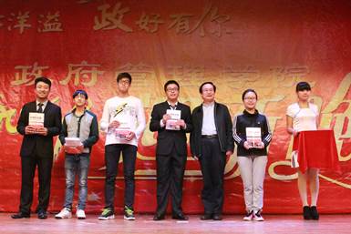 接下来的院长致辞更是把晚会气氛推向高潮。赵景华院长面带笑容,用高昂的语调表达了对2014级新生的欢迎,并高度赞扬了晚会节目的精彩——是一种饕餮盛宴的享受,一种政管情谊的感受和一个多年后暮然回首的回忆。“青春洋溢,政好有你”的晚会主题被院长进一步升华到“梦想成功”的境界。赵景华指出,“成”即成就自己,“功”即功德天下。赵院长说:“大学四年是成功的一部分,你们要做好梦,实现自己的梦想,要铭记,正气浩然,上善若水!”讲话最后,他预祝同学们过好今后的大学生活,前程似锦。谆谆教诲情意切,一片冰心在玉壶。热烈的掌声充分体现了同学们的感恩与认同。讲话结束后,晚会进行了赠书仪式,赵院长向各班代表赠送了管理学类经典图书,勖勉政管奋勇前行。