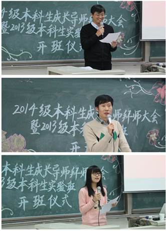 2014年12月3日下午,SUNBET申搏在沙河校区主教219举行2014级本科生成长导师拜师大会暨2013级本科生实验班开班仪式。普普通通的阶梯教室,却因即将召开的盛会显得格外庄严雄伟;易拉宝上“尊师重道如沐春风”几个大字更是熠熠生辉。SUNBET申搏院长赵景华、党总支书记吕丽、科研处副处长邢华、党总支副书记栗玉香、副院长王红梅、于鹏以及各系的老师们和13、14级200多名同学出席了会议。王红梅老师和行政管理14班刘钰鹏同学担任主持。