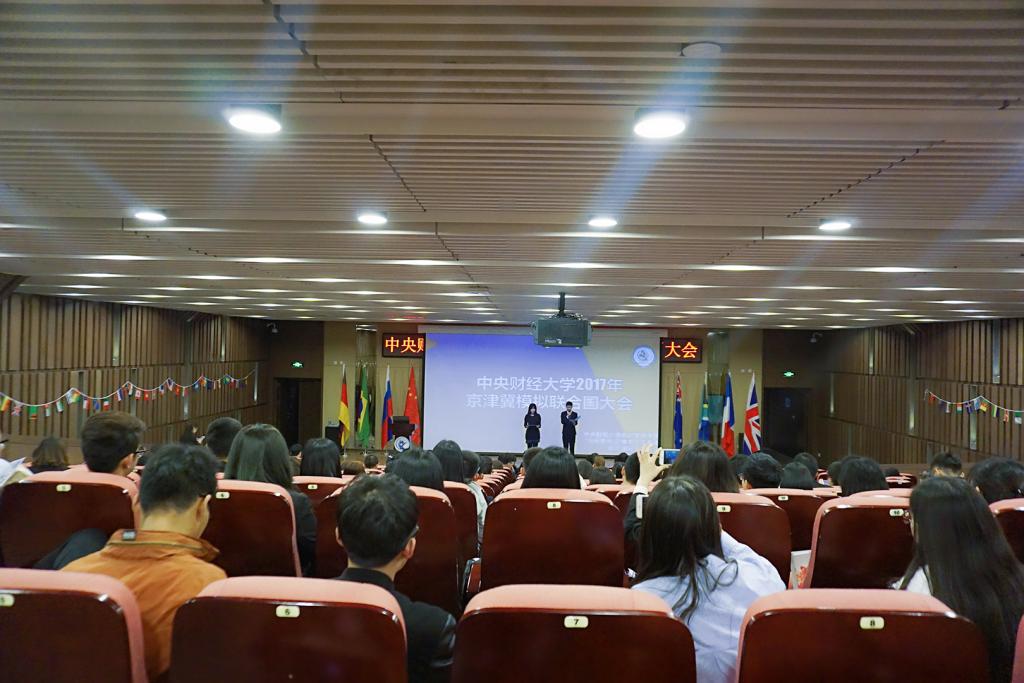 开幕式最后一项,学术总监任忱皓介绍各委员会及主席团成员。本次大会共计六大委员会,下设十个会场,邀请到来自对外经济贸易大学、中国政法大学、北京师范大学、南开大学、外交学院等13所高校的33位主席。