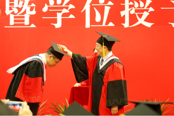 典礼进行第七项,学位授予仪式。在庄严而令人激动的乐曲声中,赵景华院长与2018届毕业生握手,拨正流苏,颁发毕业证书和学位证书,并合影留念。深深鞠躬,是对老师和学院数年栽培的真挚感谢;流苏拨正,再抬头便是迎着全新的道路。