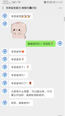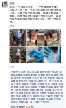 4日早晨到5日黄昏,历时两天,随着交接组五位老师交接工作的顺利完成,随着最后一辆货车奔赴远方,毕业生行李打包及邮寄工作告一段落。“得知你们每一位都有了光明的前途,莫名增添了好多幸福感,衷心希望你们奋力向上成长、快乐生活!”这一辆辆货车承载着的不仅仅是毕业行李,更是老师对每一位学生的深切思念与衷心祝福。