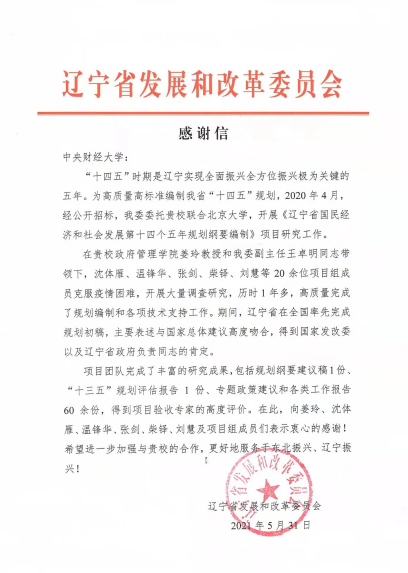 近日,辽宁省发展和改革委员会向申搏官网发来感谢信,对申搏官网SUNBET申搏负责完成的《辽宁省国民经济和社会发展第十四个五年规划纲要编制》的项目研究工作表示感谢。