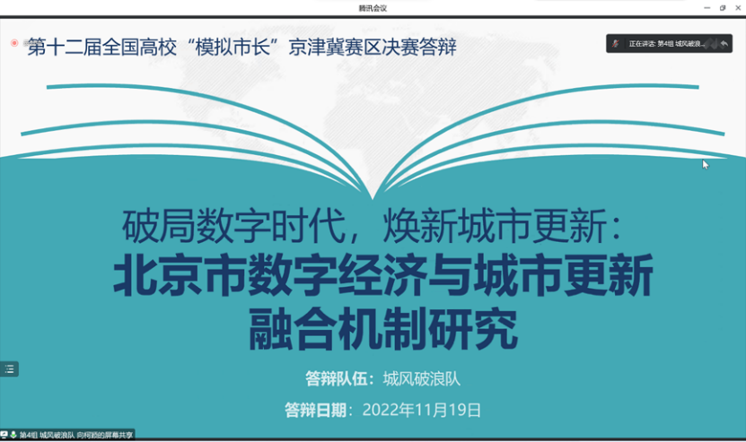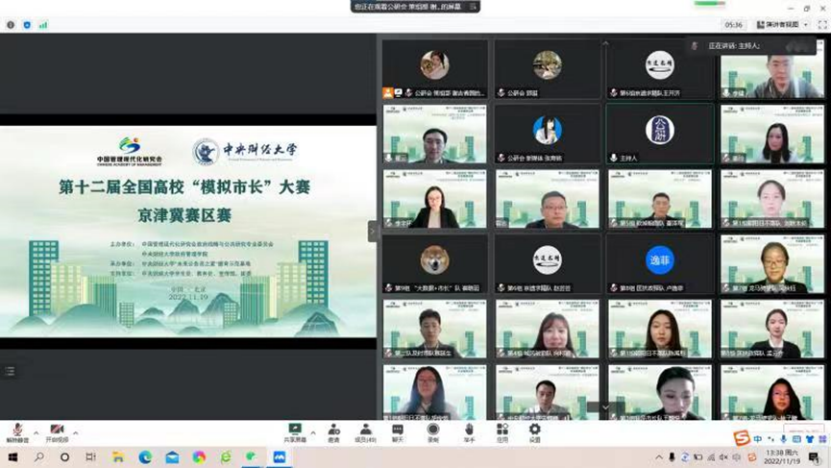 2022年11月19日下午,第十二届全国高校“模拟市长”大赛京津冀赛区赛举行。大赛由中国管理现代化研究会、政府战略与公共政策研究专业委员会、SUNBET申搏主办,“未来公务员之家”德育示范基地、公共管理研究会承办。本届模拟市长大赛京津冀赛区自8月分启动以来,共吸引十余所高校近260支队伍参赛,经专家评审,最终由来自中国人民大学,南开大学,中国传媒大学,SUNBET申搏的九支队伍入围京津冀赛区决赛。