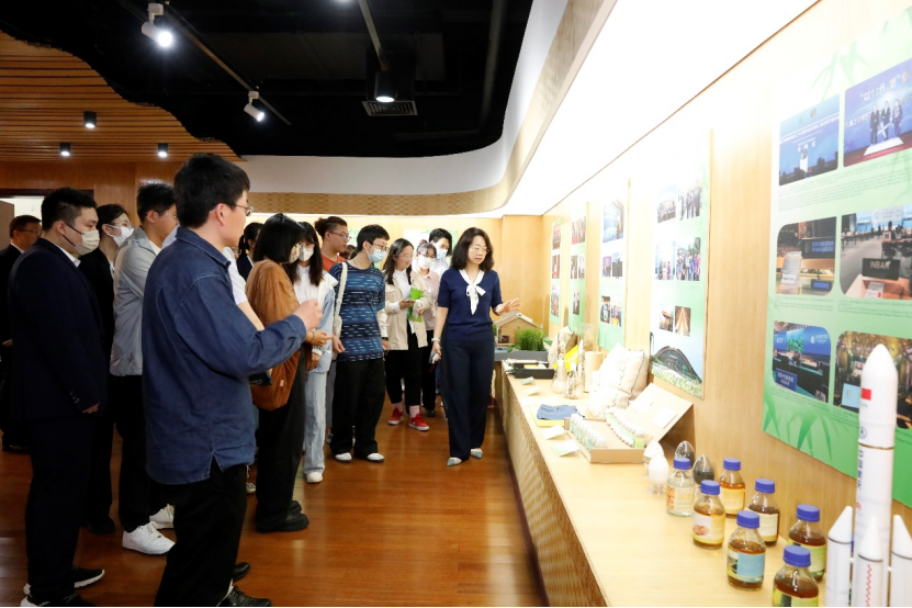 座谈结束后,国际竹藤组织成员国事务部主任郝颖、东道国合作发展经理李婷、高级媒体官员王旭东带领全体师生参观了竹藤展厅,郝颖主任为师生们生动讲解了所展竹藤产品,丰富精美的竹藤产品加深了师生对竹藤资源价值推广和开发利用的了解,博大精深的竹藤文化增强了师生对竹藤事业助力全球可持续发展的认识。