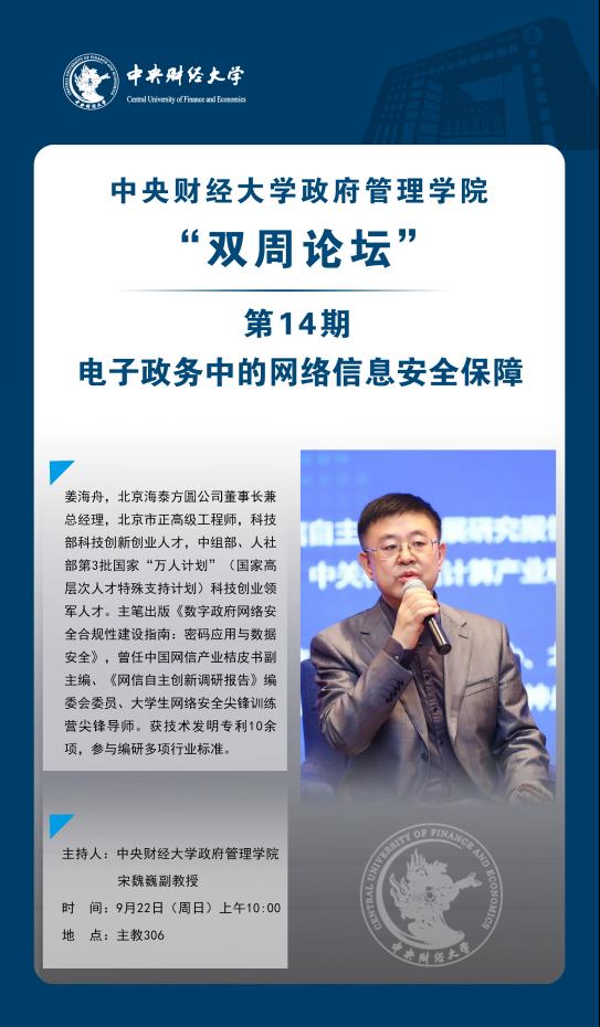 主讲人简介:姜海舟,北京海泰方圆公司董事长兼总经理,北京市正高级工程师,科技部科技创新创业人才,中组部、人社部第3批国家“万人计划”(国家高层次人才特殊支持计划)科技创业领军人才。主笔出版《数字政府网络安全合规性建设指南:密码应用与数据安全》,曾任中国网信产业桔皮书副主编、《网信自主创新调研报告》编委会委员、大学生网络安全尖锋训练营尖锋导师。获技术发明专利10余项,参与编研多项行业标准。